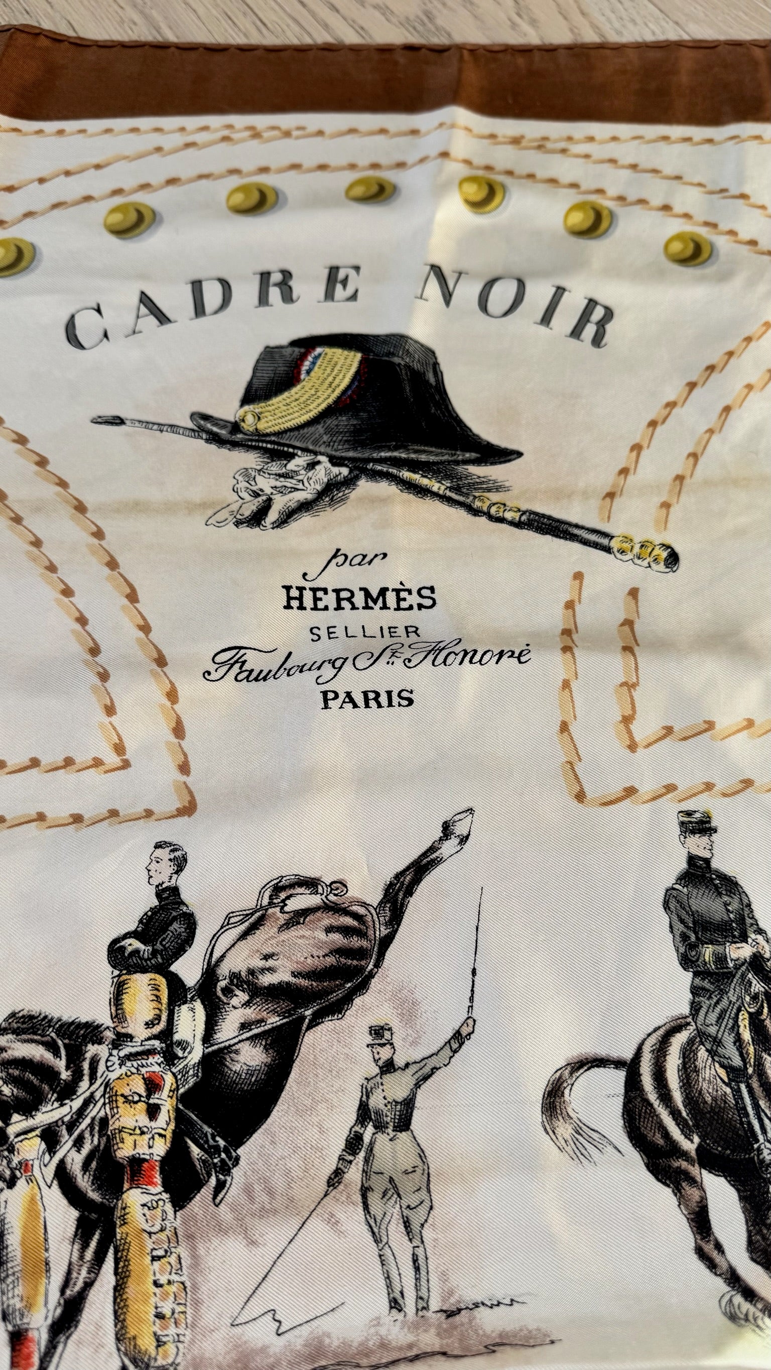 Hermès Cadre Noir Brown Cream Silk Scarf